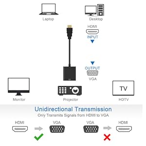 - This is a unidirectional device, it works from HDMI to VGA, not in reverse. It means your source should be HDMI and destination should be VGA, no audio output.