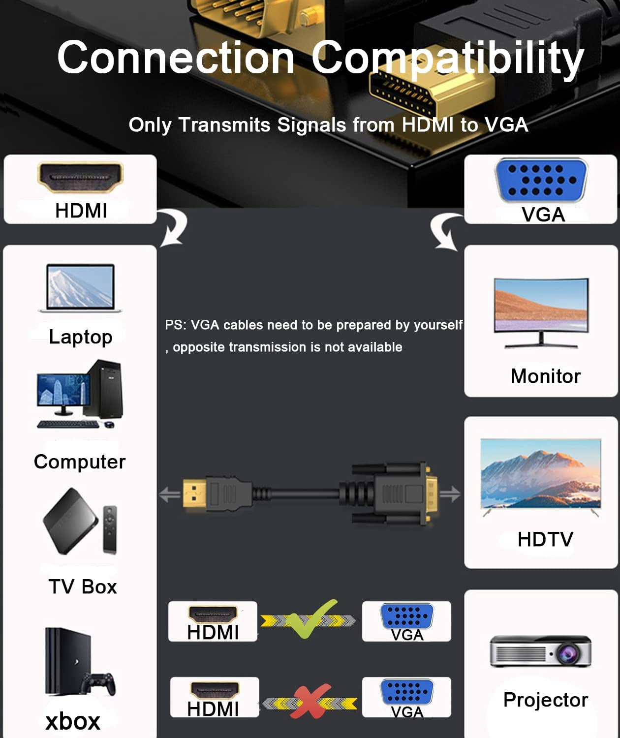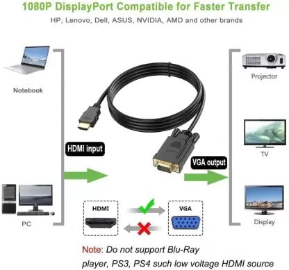 - 【HDMI to VGA Adapter】: Built-in advanced IC chip converts HDMI digital signal to VGA analog signal; It is NOT a bi-directional converter and cannot transmit signals from VGA to HDMI. Just plug & play, no need extra HDMI or VGA cable, no driver installation needed.