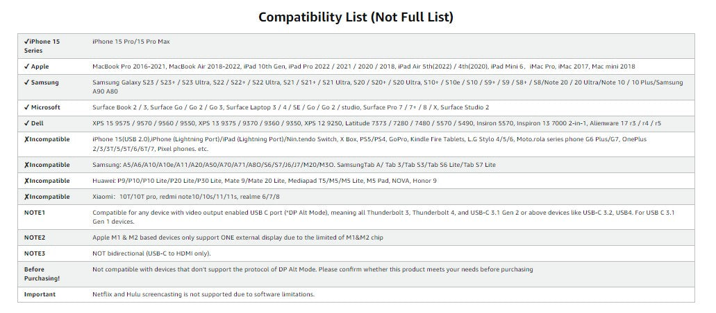 【Wide Compatibility】:Compatible with iPhone 15 15 Pro 15 Plus 15 Pro Max, Surface Book 2, Surface go, iMac 2017, Samsung Galaxy S21 S21+ S20 Ultra S20+ Z Flip S20+ Note 10 S10 S9 S8 Plus, HTC U11, Dell XPS 15 13, HP Envy 13, Galaxy Book, Pixel Book, Chromebook, Intel NUC, Pixel Slat (see detailed product description section below) ---kindly reminder: for devices with USB 3. 1 Gen 1 and Smartphones, it may take longer time to sync. ❌Not compatible with any Pixel phones.
